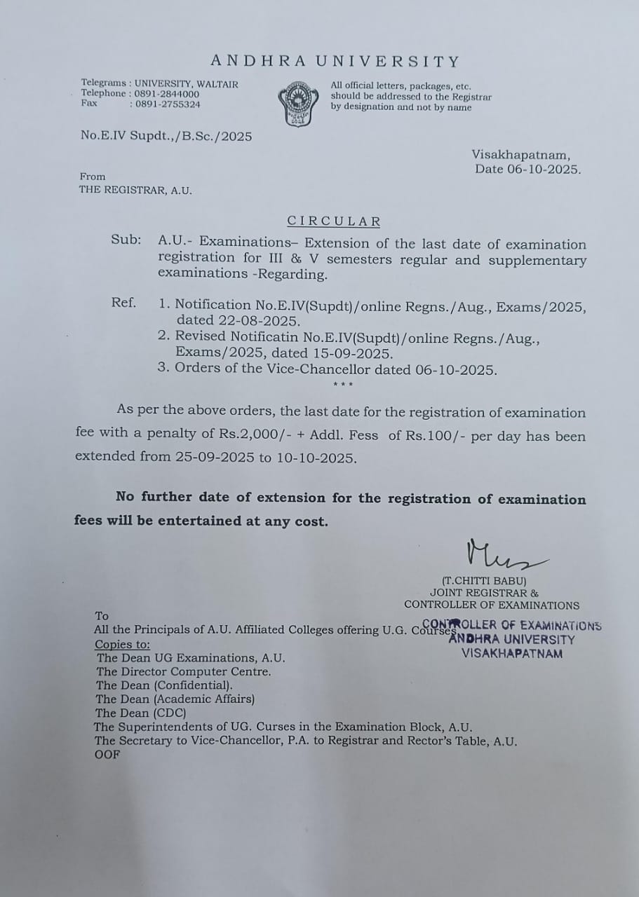 8 | 08/10/25 | Law - Schedule for Posting of Internals and Externals Marks Through Online Portal of Andhra University for Second Semester(1-2) - August 2025 Click here |
