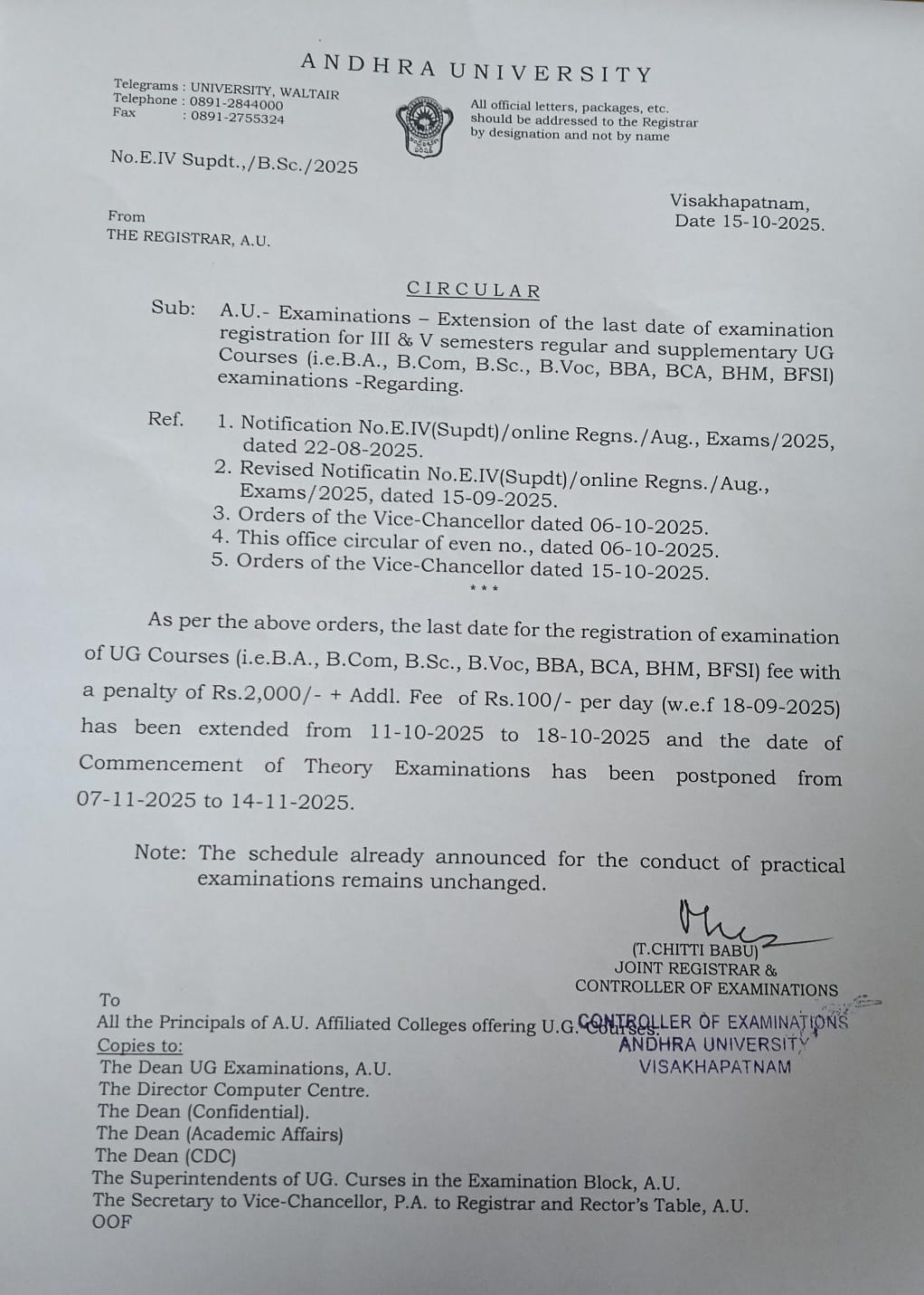 89 | 03/07/25 | Circular - AU Examinations - Calling for Special Examination application for Foreign Students of UG, PG and Professional Courses Click here |