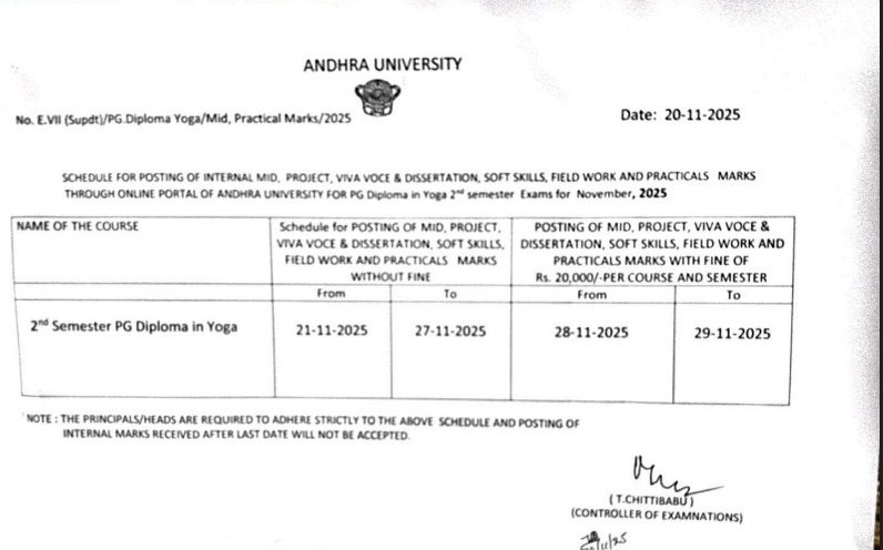 | 10 | 21/11/25 | P.G Diploma Yoga - Schedule for Posting of Internal Mid, Project, Viva Voce & Dissertation, Soft Skills, Field Works and practical Marks Through Online Portal of Andhra University for PG Diploma in Yoga for (1-2) Semester - November 2025. Click here |