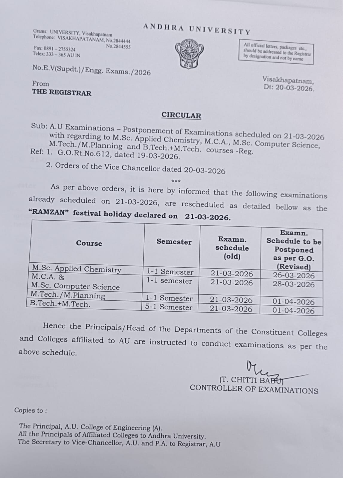 | 2 | 20/03/26 | Circular - Postponement of Examinations Scheduled on 21-03-2026 Click here new |