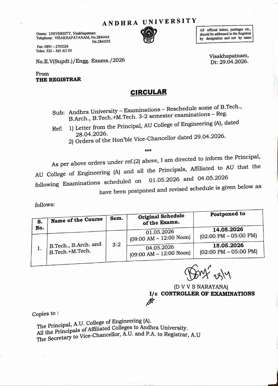 | 5 | 28/04/26 | Exams Reschedule - M.Sc Courses (All Courses) Second Year Second Semester(2-2) Regular and Supplementary Examinations Time Tables, April 2026. Click here new |